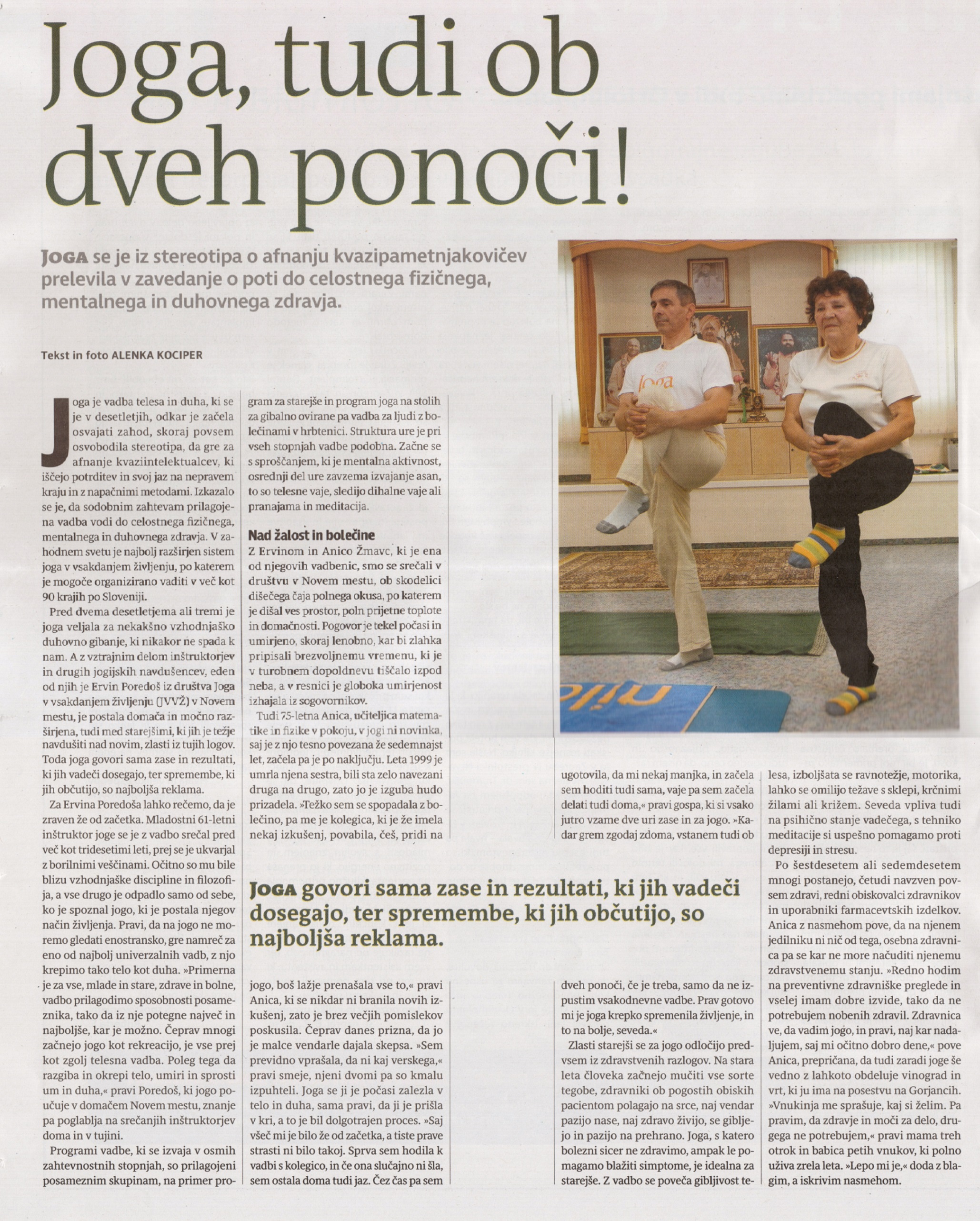 Z dovoljenjem objavljamo članek Alenke Kociper "Joga, tudi ob dveh ponoči!", ki je izšel v novembrski številki priloge Super 50 (k Delu in Slovenskim novicam). Z naklado 110.000 izvodov je za Nedeljskim in ob prilogi Ona to najbolj bran tiskan medij pri nas.